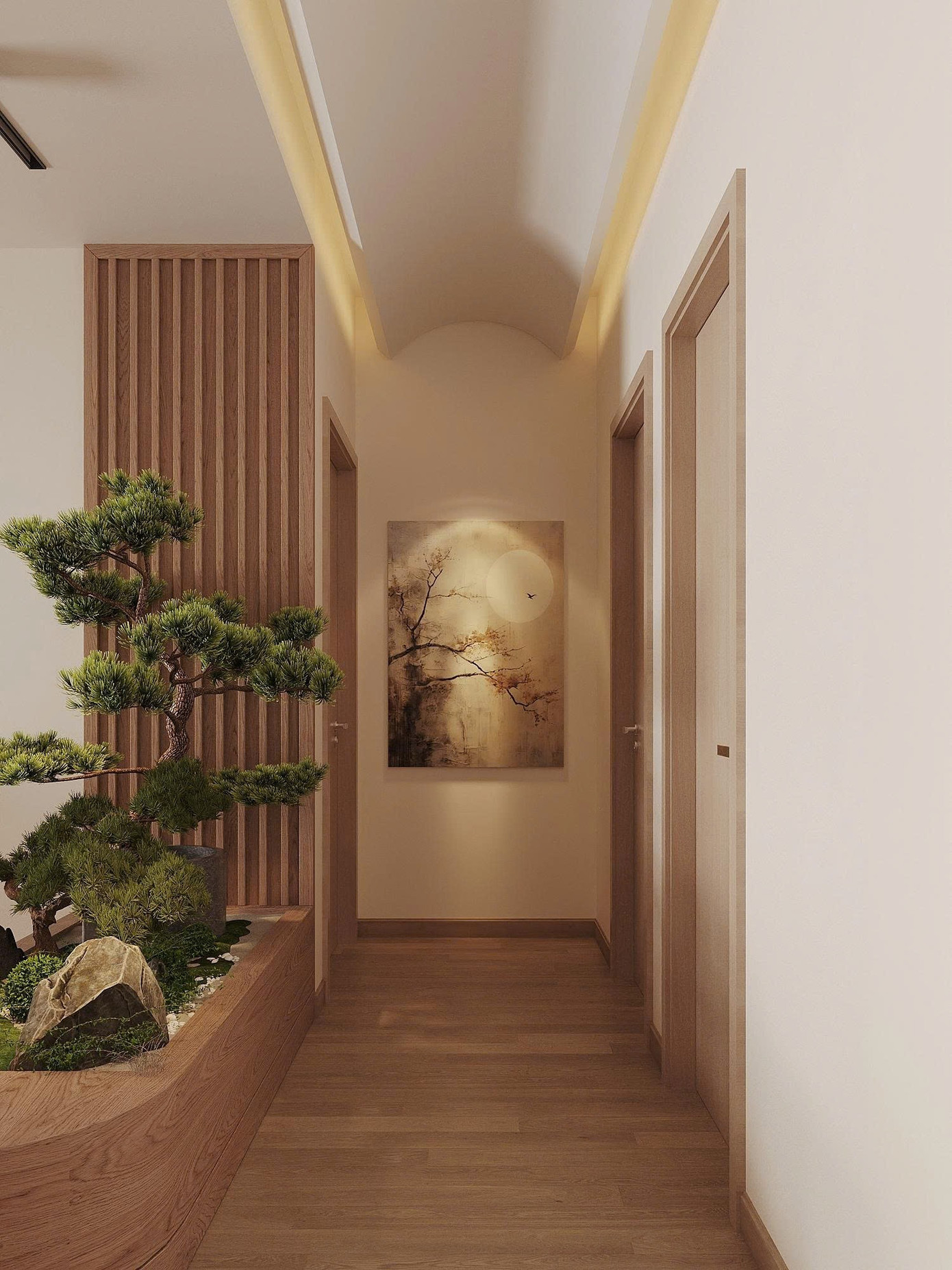 Bố trí một tiểu cảnh theo mong muốn của chủ nhà, bo cong góc kết hợp tường lam gỗ làm điểm nhấn, phân tách nhẹ nhàng hành lang vào hai phòng ngủ và khu vực bàn ăn.