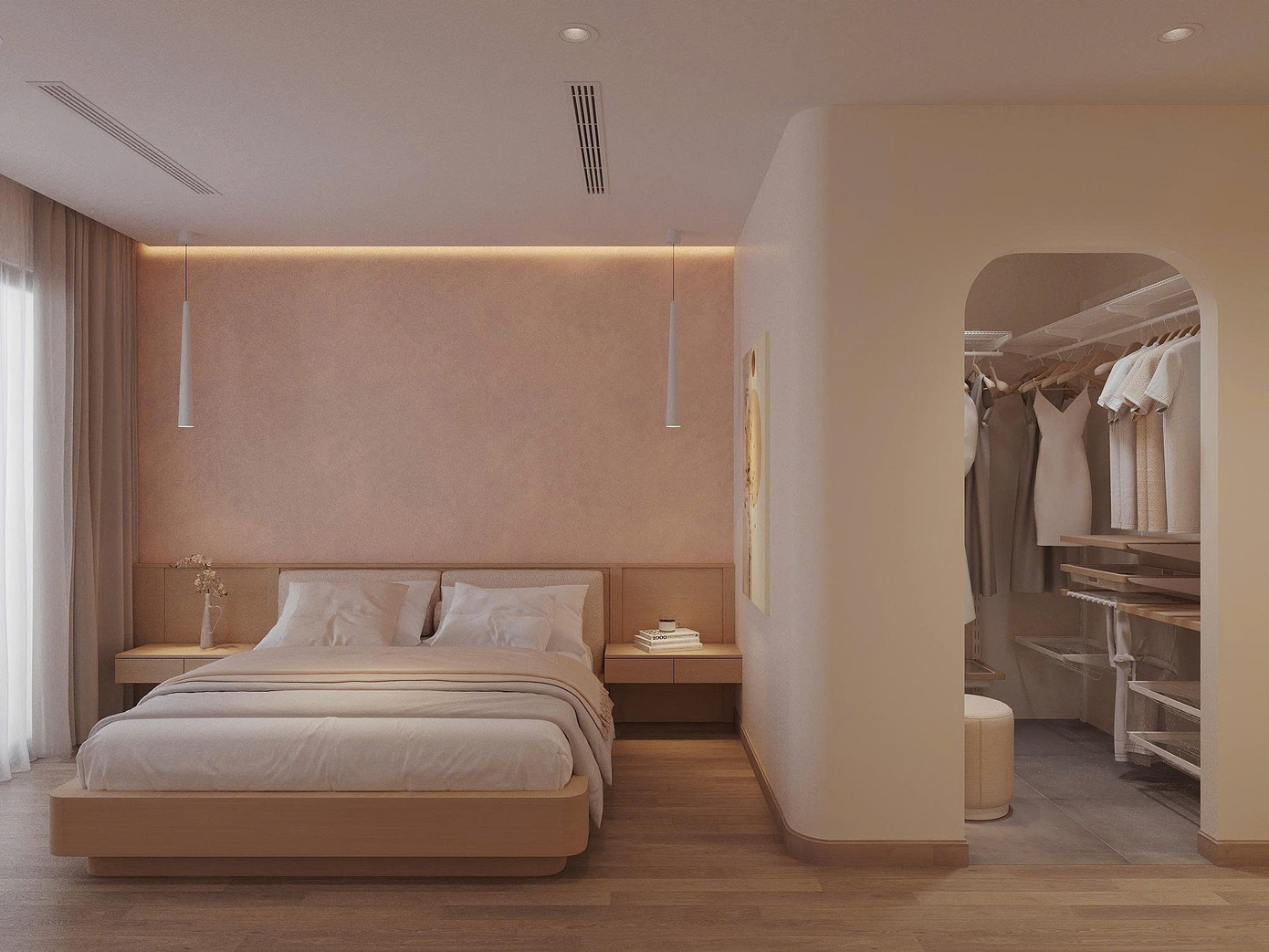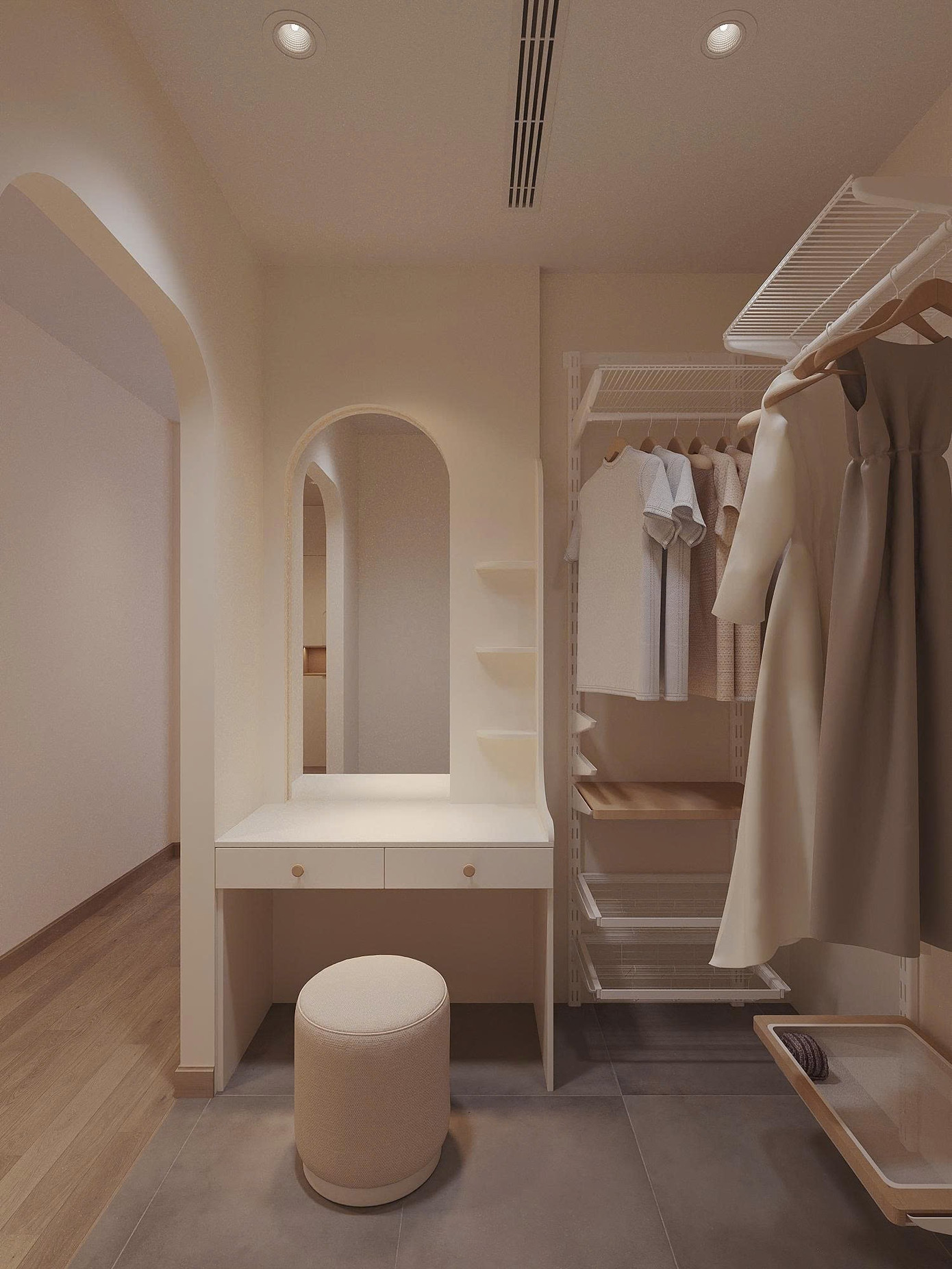 Sau cửa vào tận dụng làm thêm hệ tủ có hộc trang trí kết hợp tủ giày phụ trong phòng, tay nắm âm gọn gàng và liền lạc. Khu vực thay đồ được tách biệt với phòng ngủ chính thông qua một lối đi dạng vòm cong mang lại sự riêng tư và nét kiến trúc mềm mại. Kết hợp làm góc bàn trang điểm với gương vòm cong đứng, tạo sự đồng điệu với lối vào.