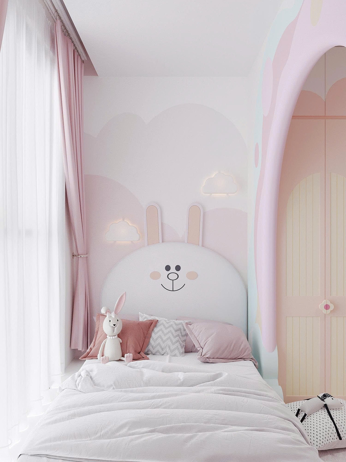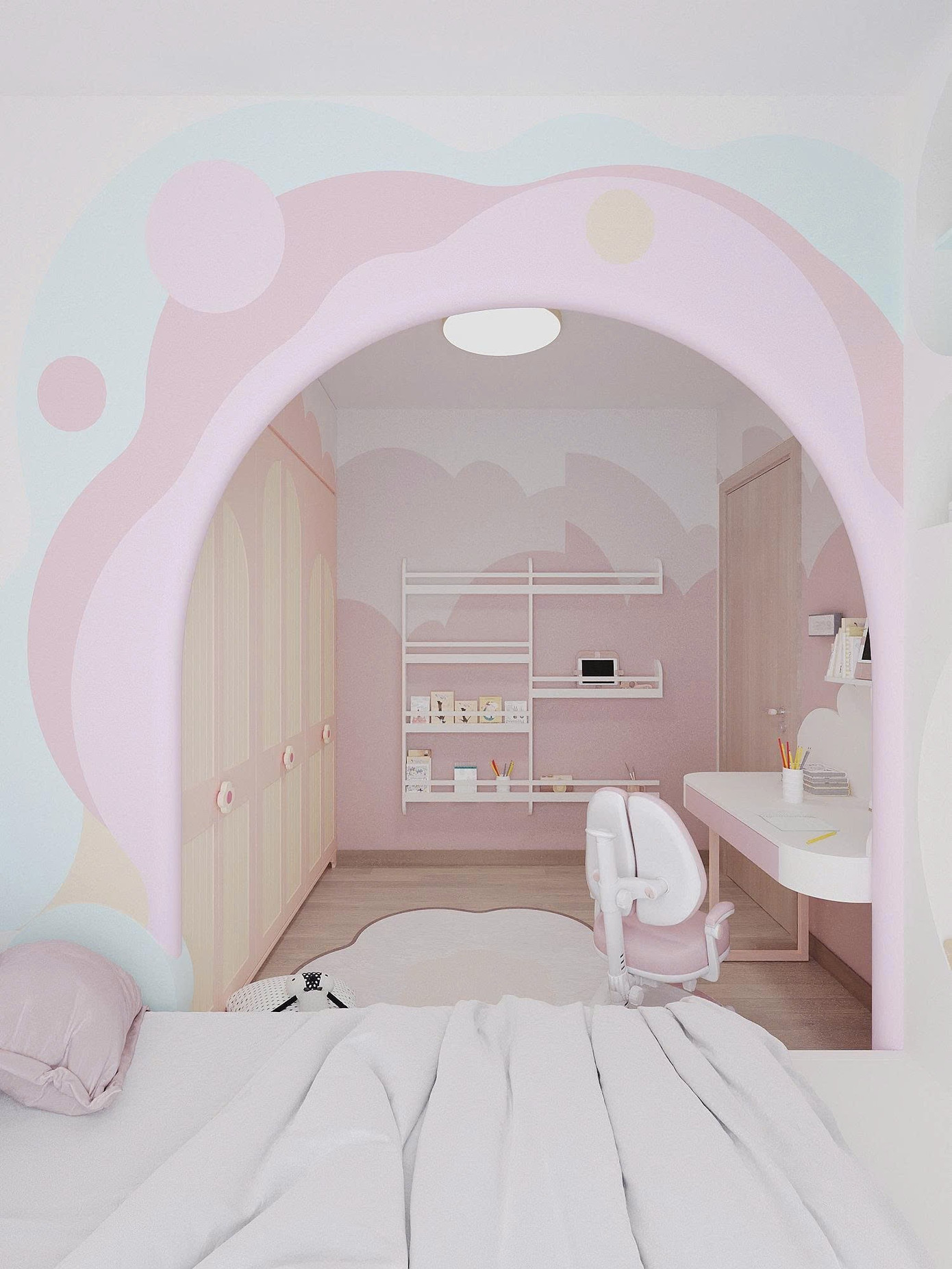Phòng ngủ con sáng tạo và đa màu sắc theo sở thích của cháu bé, vẫn đảm bảo công năng học hành ngủ nghỉ. Không gian sử dụng bảng màu pastel ngọt ngào chủ đạo là hồng, kết hợp với các chi tiết xanh mint và vàng nhạt.